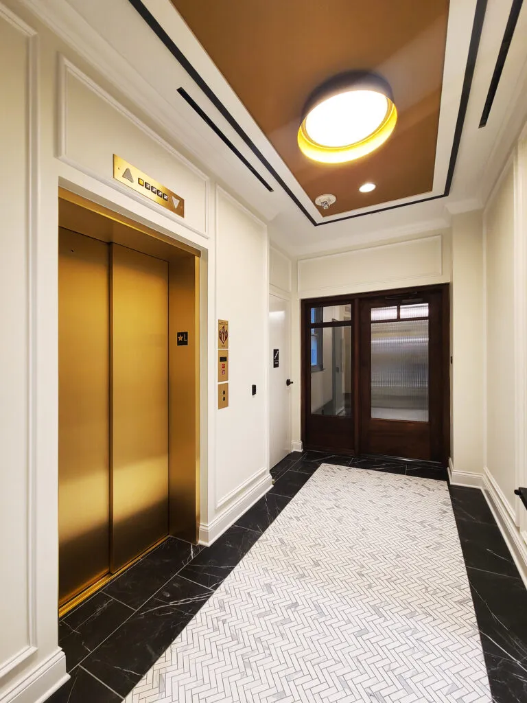 A repeat client, the Rittenhouse Plaza’s renovation of their adjoining three-story shell created new retail spaces on the first two floors and a high-end apartment on the third floor. The project included the addition of a four-stop MRL elevator, new MEP systems, and restoration of the building’s historical exterior. The apartment featured a two-bedroom and two-bathroom layout with a kitchen and living room, while the retail spaces were prepared for future tenants. The scope also included roof patching, window replacement, plaster patching, and the historical preservation of the exterior of the building.